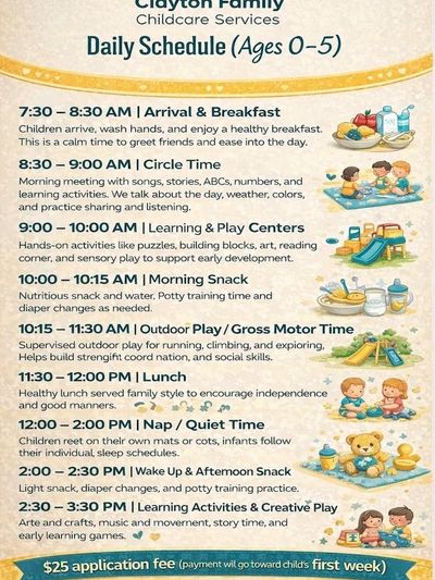 This daily routine provides structure, learning, play, rest, and consistent care to help every child grow, feel safe, and have fun.